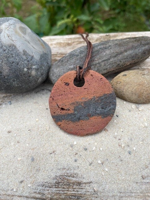 Der Kettenanhänger wird aus recyceltem Zigelestein handgefertigt. Jedes Stück ist ein Unikat und zeigt ein individuelles Muster- kein Anhänger gleicht dem anderen